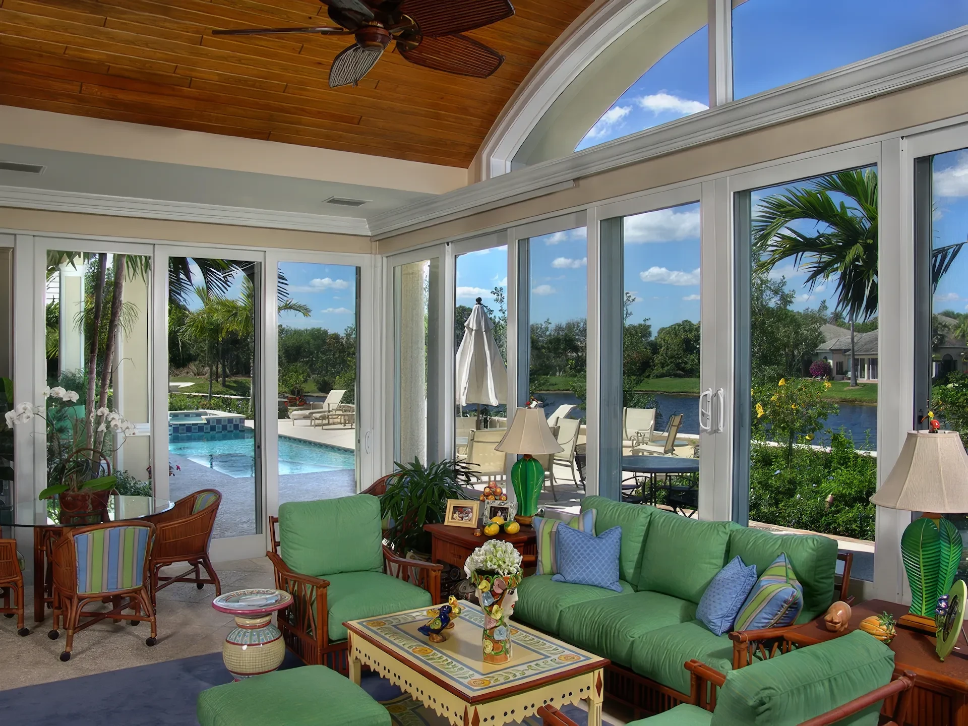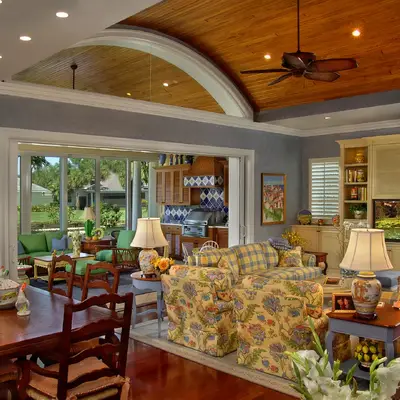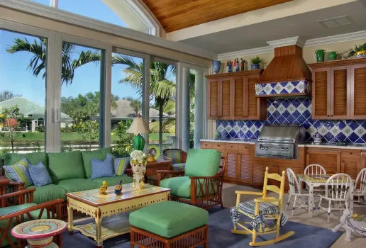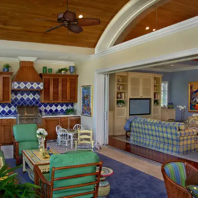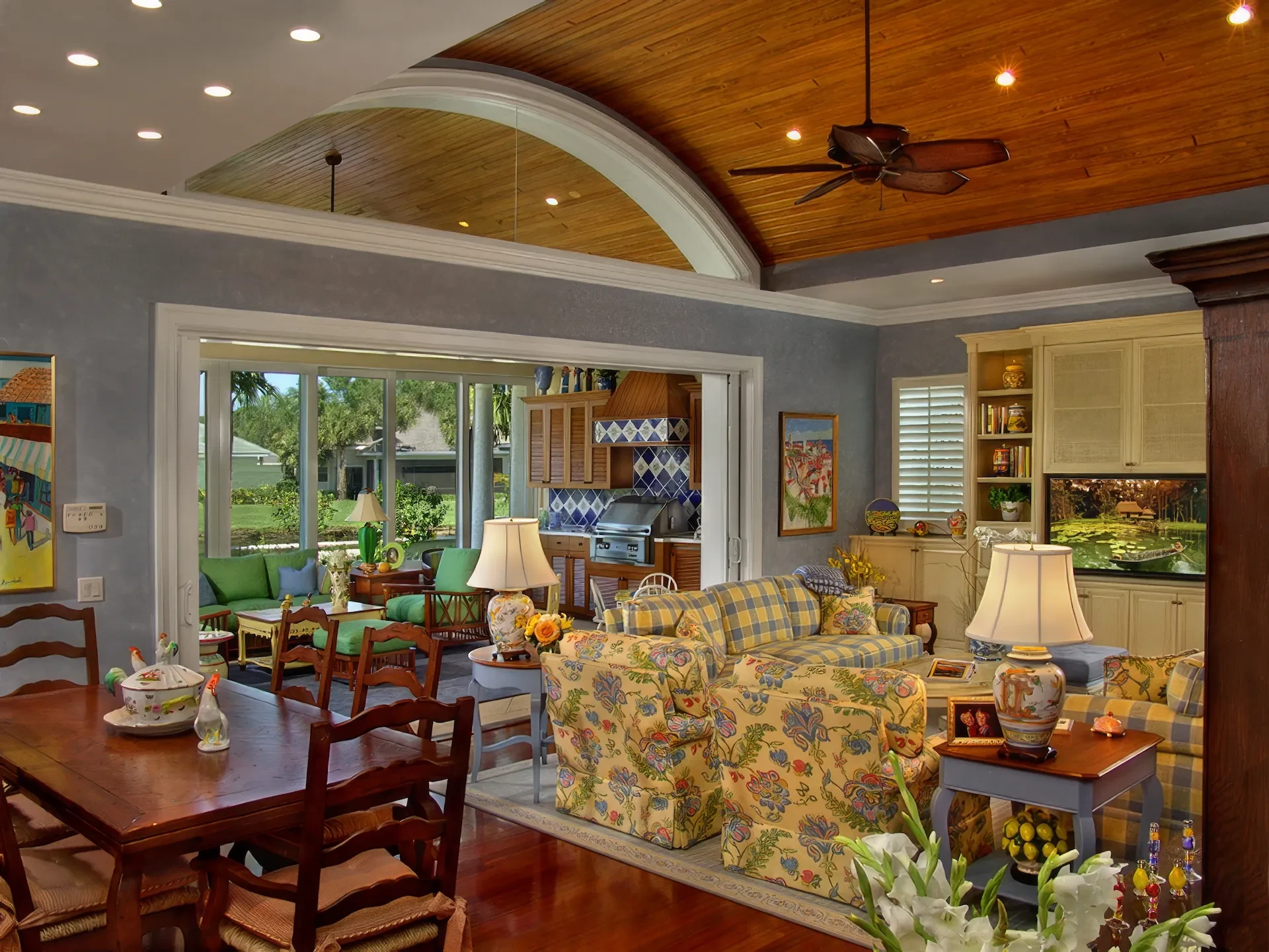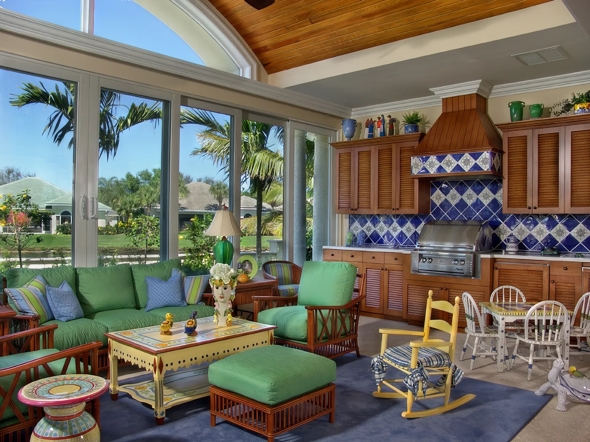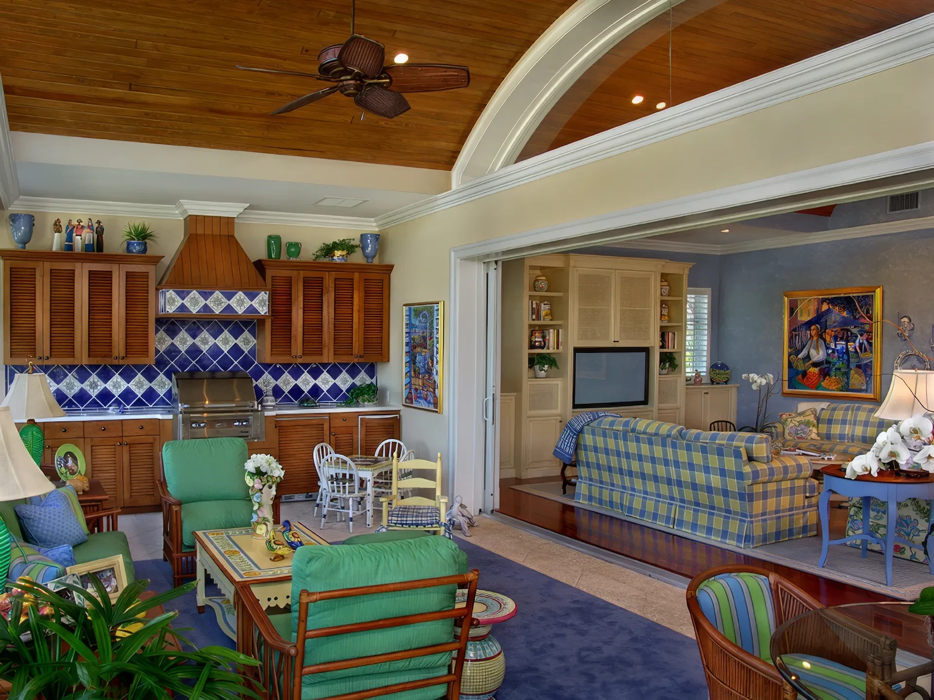 The kitchen and dining area are basically the same room divided only by the architectural ceiling details. The rear enclosed Florida room becomes one large family room when the 20 fully pocketing doors are opened and stowed away. The barrel vault ceiling continues through the family room and into the Florida room, only eclipsed by a radius glass transom. The Florida room includes an outdoor kitchen, which features a custom-built hood and cabinets, hand-painted tiles, and an outdoor refrigerator.