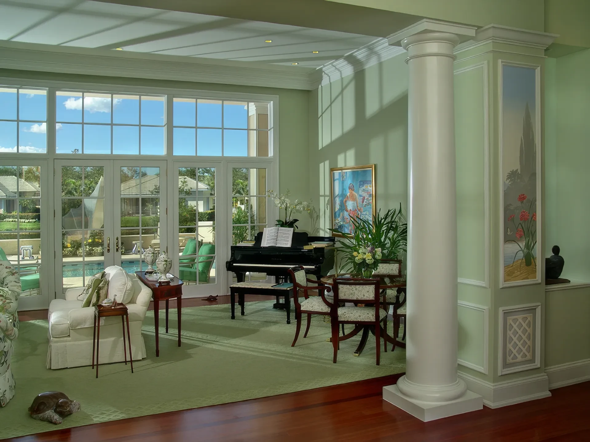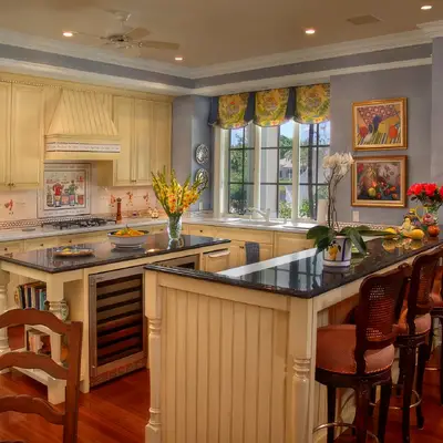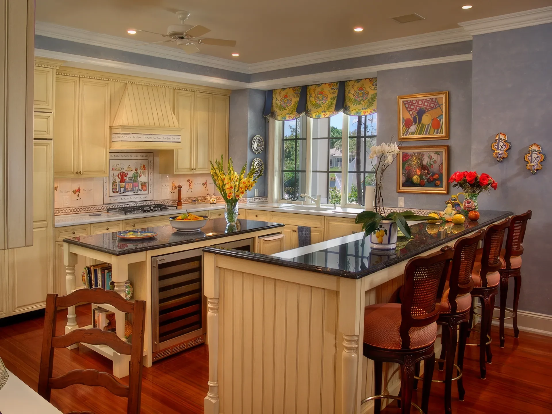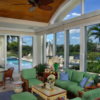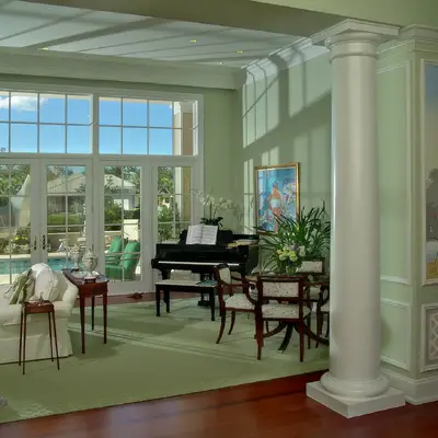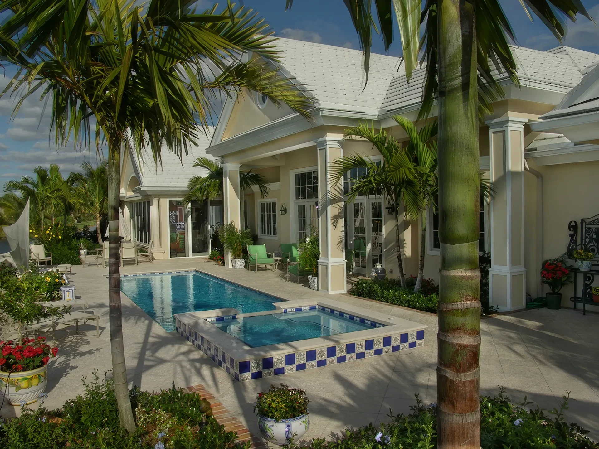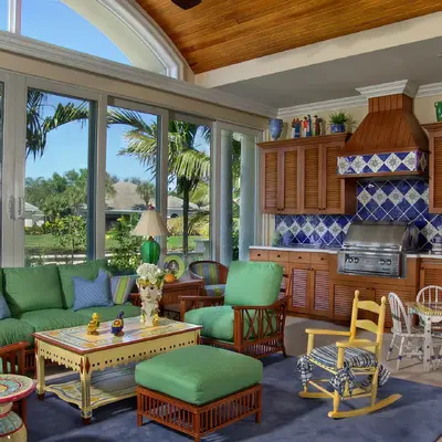 The kitchen and dining area are basically the same room divided only by the architectural ceiling details. The rear enclosed Florida room becomes one large family room when the 20 fully pocketing doors are opened and stowed away. The barrel vault ceiling continues through the family room and into the Florida room, only eclipsed by a radius glass transom. The Florida room includes an outdoor kitchen, which features a custom-built hood and cabinets, hand-painted tiles, and an outdoor refrigerator.