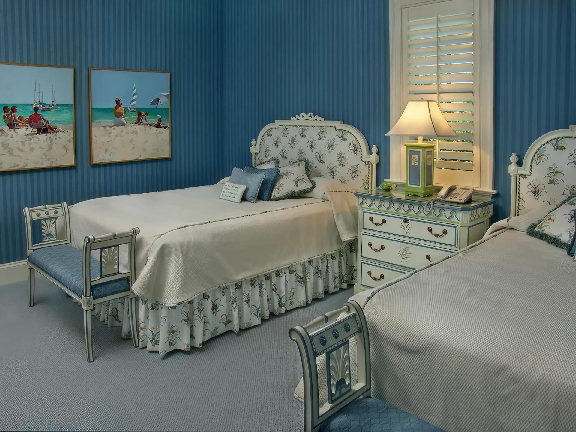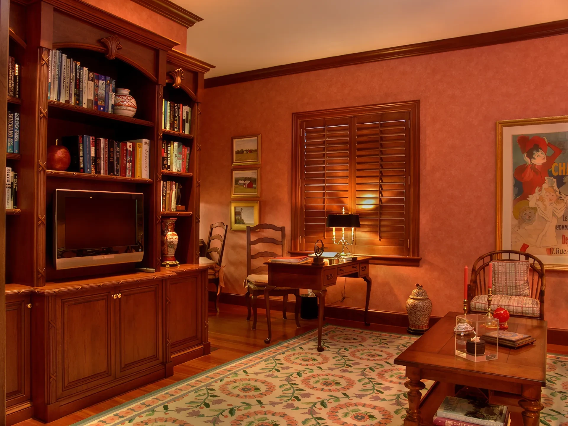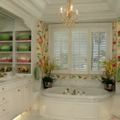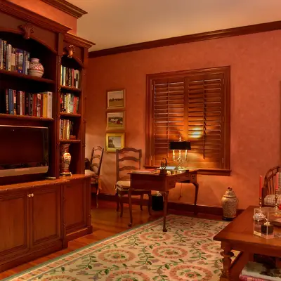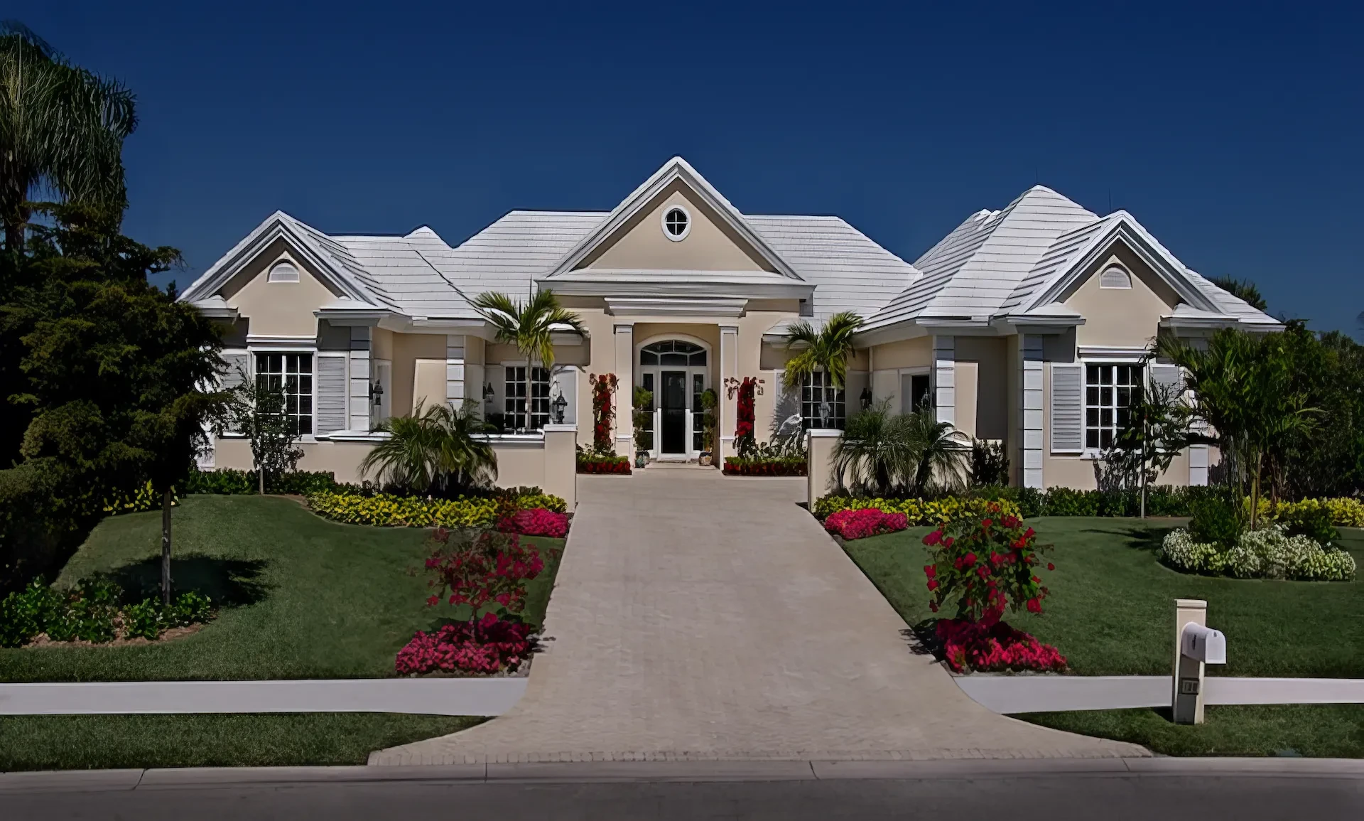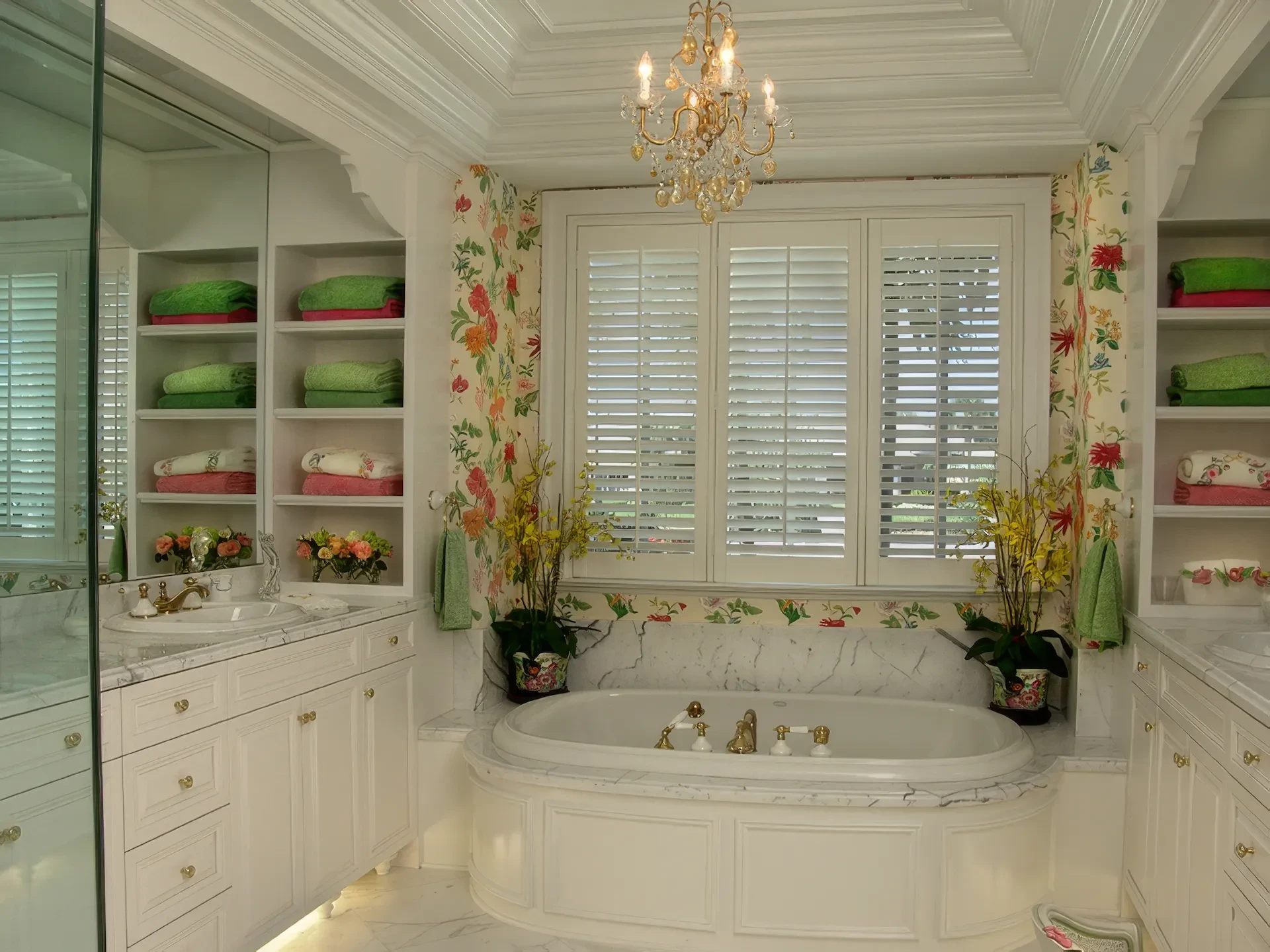 The kitchen and dining area are basically the same room divided only by the architectural ceiling details. The rear enclosed Florida room becomes one large family room when the 20 fully pocketing doors are opened and stowed away. The barrel vault ceiling continues through the family room and into the Florida room, only eclipsed by a radius glass transom. The Florida room includes an outdoor kitchen, which features a custom-built hood and cabinets, hand-painted tiles, and an outdoor refrigerator.