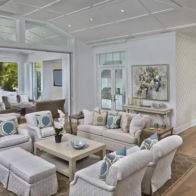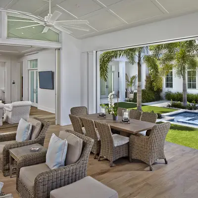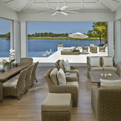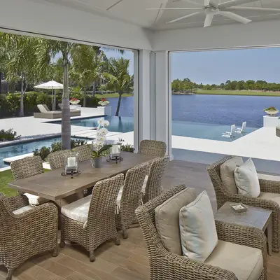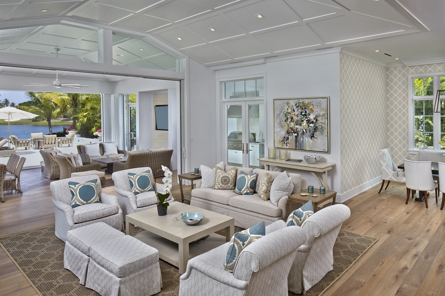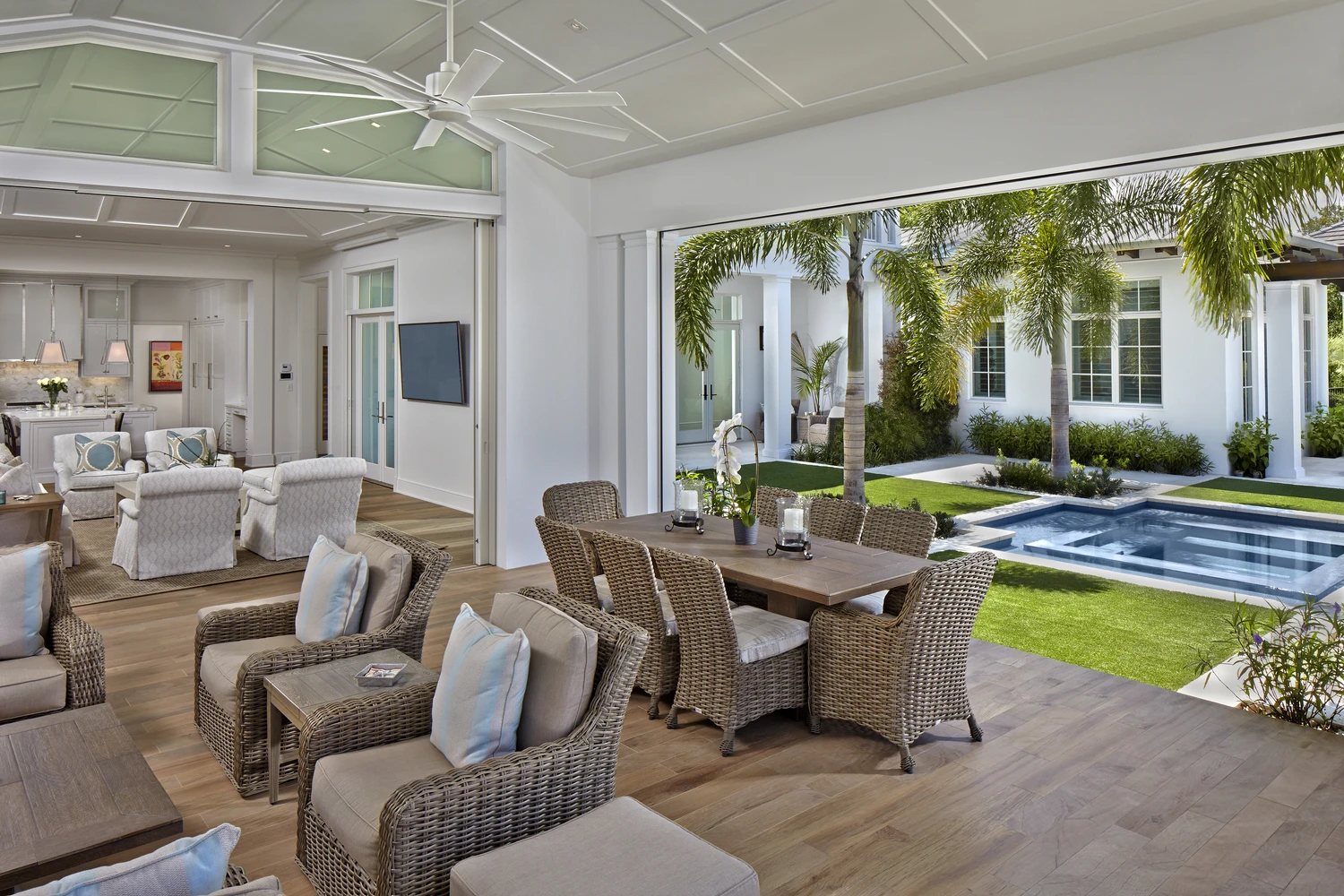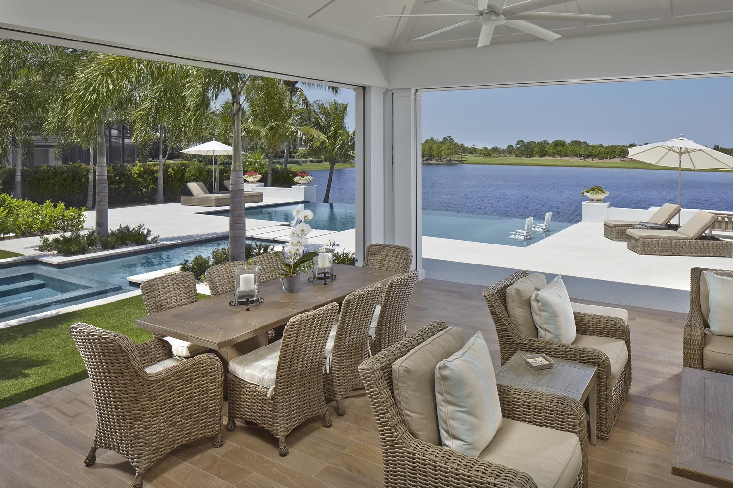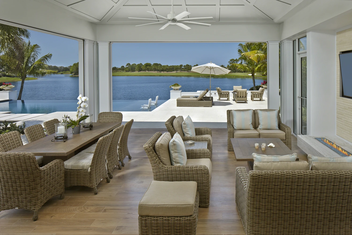 Our second home for this client features a great floor plan with a family room opening, perfectly connecting to the real rear porch. The new threshold pocketing door and wood floor match the loggia porcelain floor, creating a seamless flow. The exterior pool area features a vanishing edge pool. We did the interior design and furnishing in-house as well.