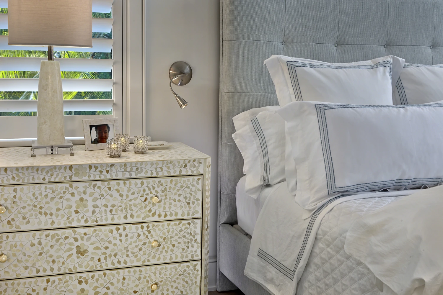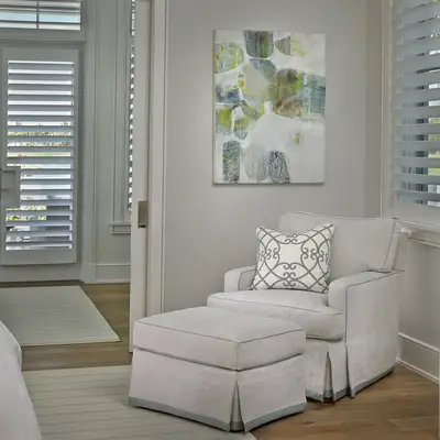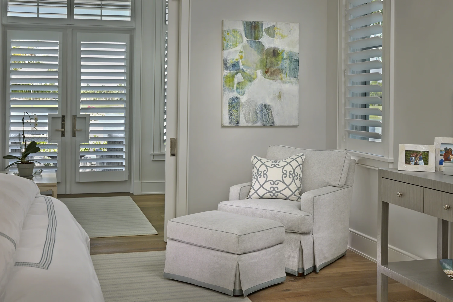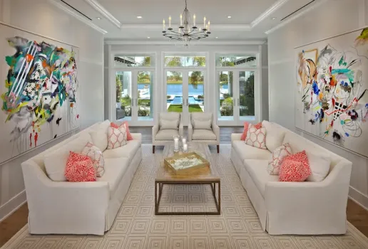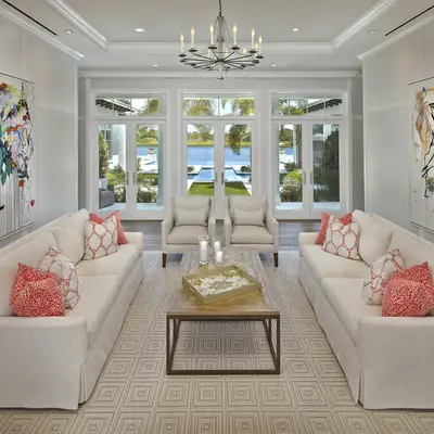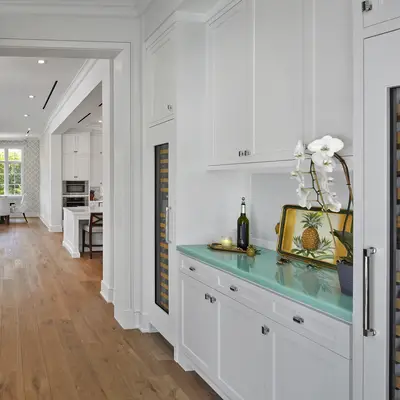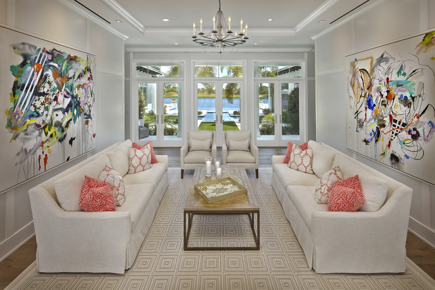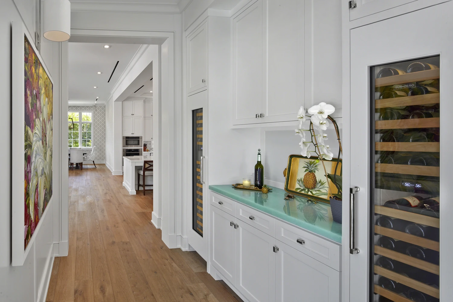 Our second home for this client features a great floor plan with a family room opening, perfectly connecting to the real rear porch. The new threshold pocketing door and wood floor match the loggia porcelain floor, creating a seamless flow. The exterior pool area features a vanishing edge pool. We did the interior design and furnishing in-house as well.