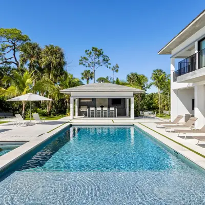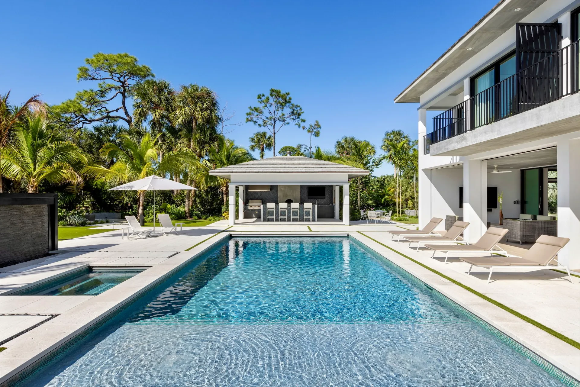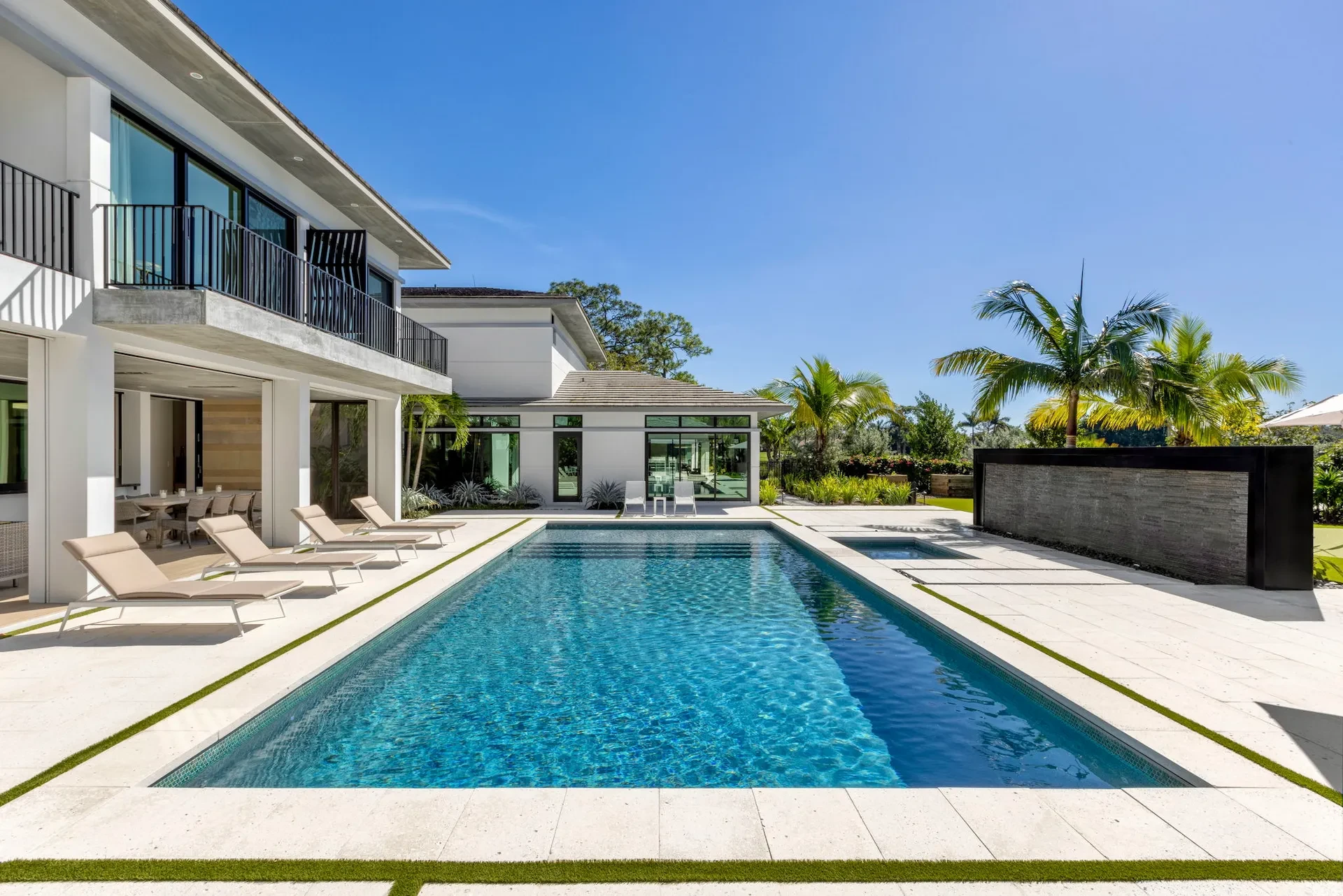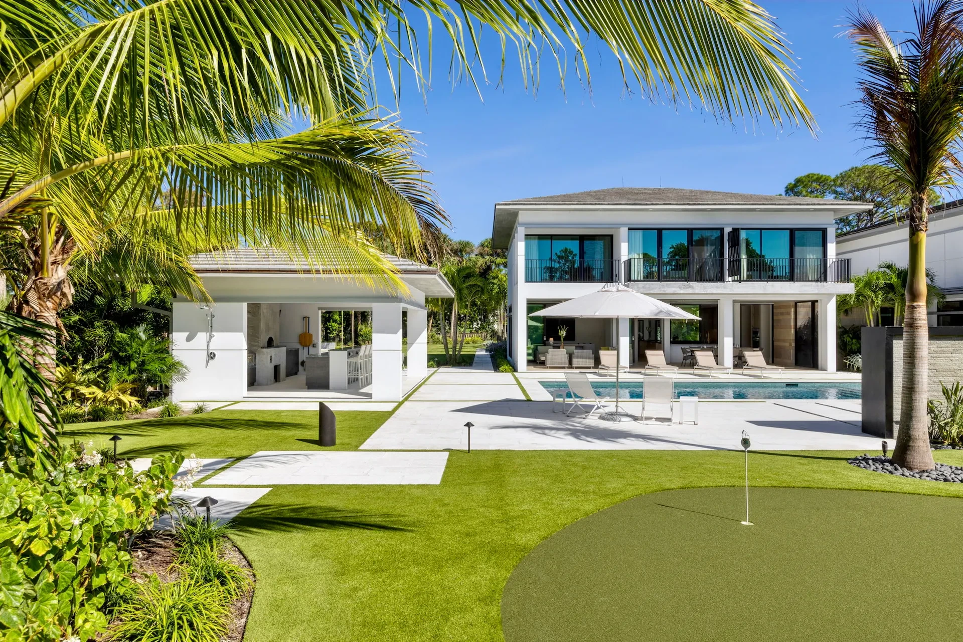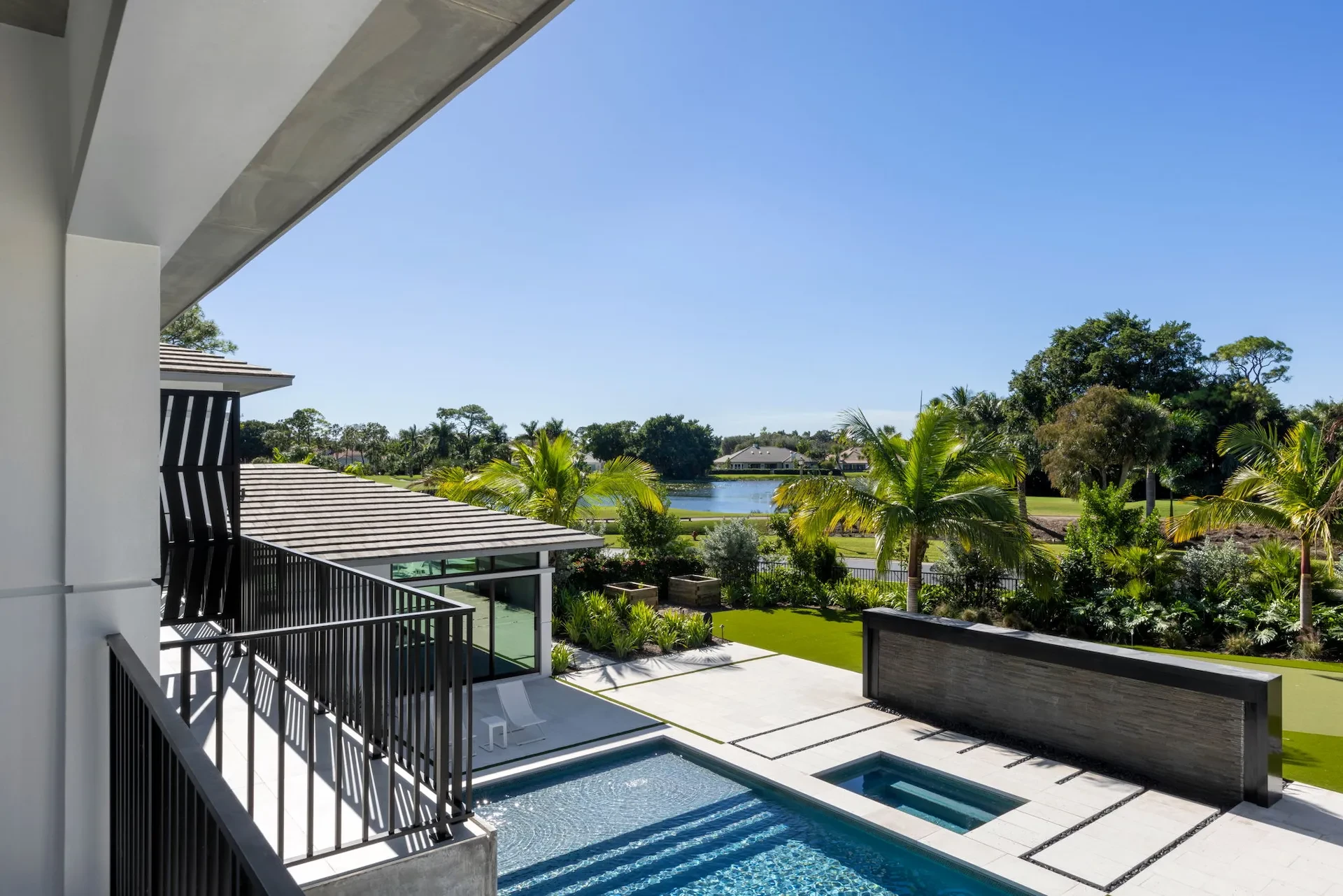 We were thrilled to contract with Joan and Jeff, having built a home for Jeff’s parents years earlier. Inspired by those fond memories, and in collaboration with award-winning architect Mitchell O’Neill, we created a modern masterpiece tailored to their passions. At the heart of the home is a water feature that subtly scores their wedding song, "It's a Beautiful Life" in the tile accents. Musical themes echo throughout, from melodic tile patterns to the rhythmic flow of space. Outdoors, a summer kitchen, bocce court, large putting green, and glowing fire pit form a luxurious playground unlike anything we’ve built before. This home? Pure harmony—and worthy of a standing ovation.