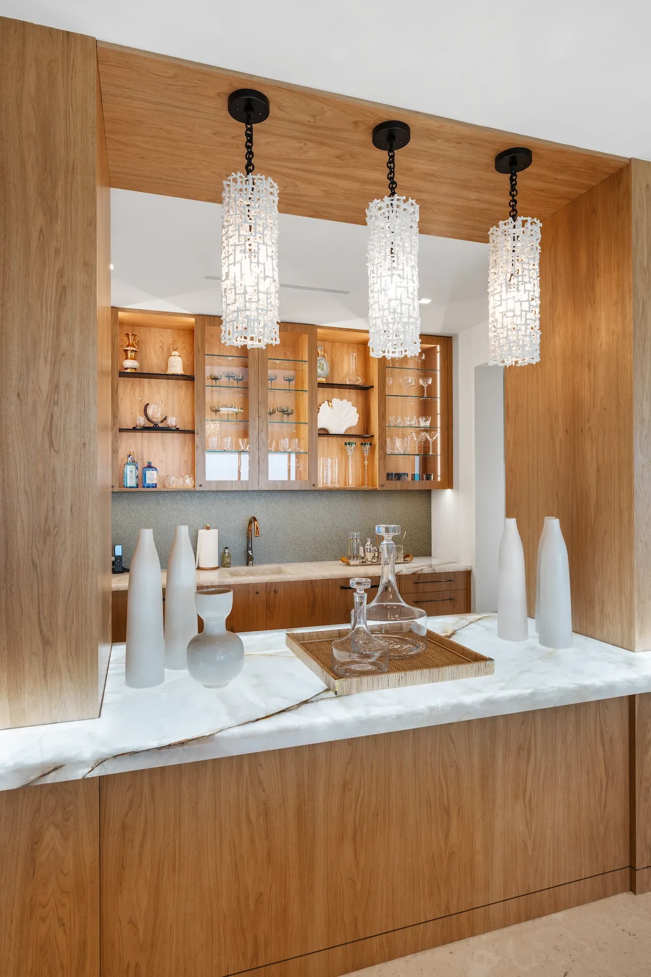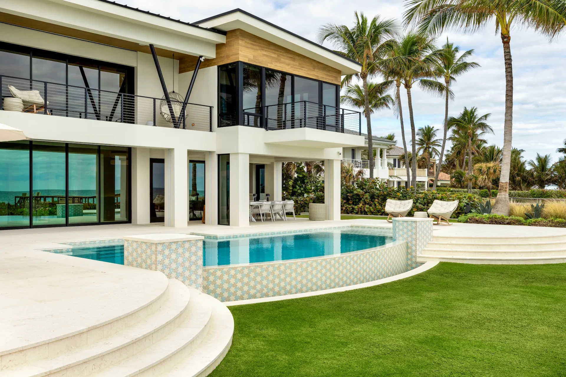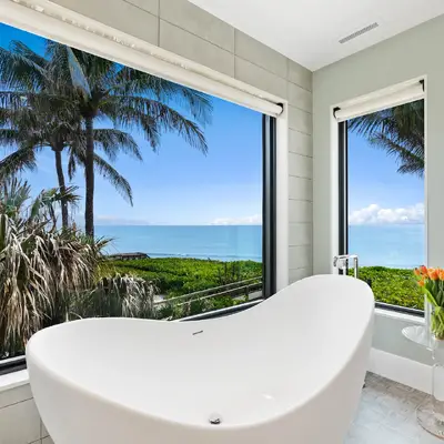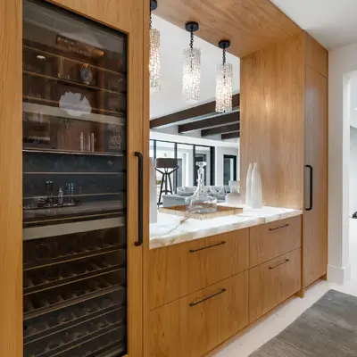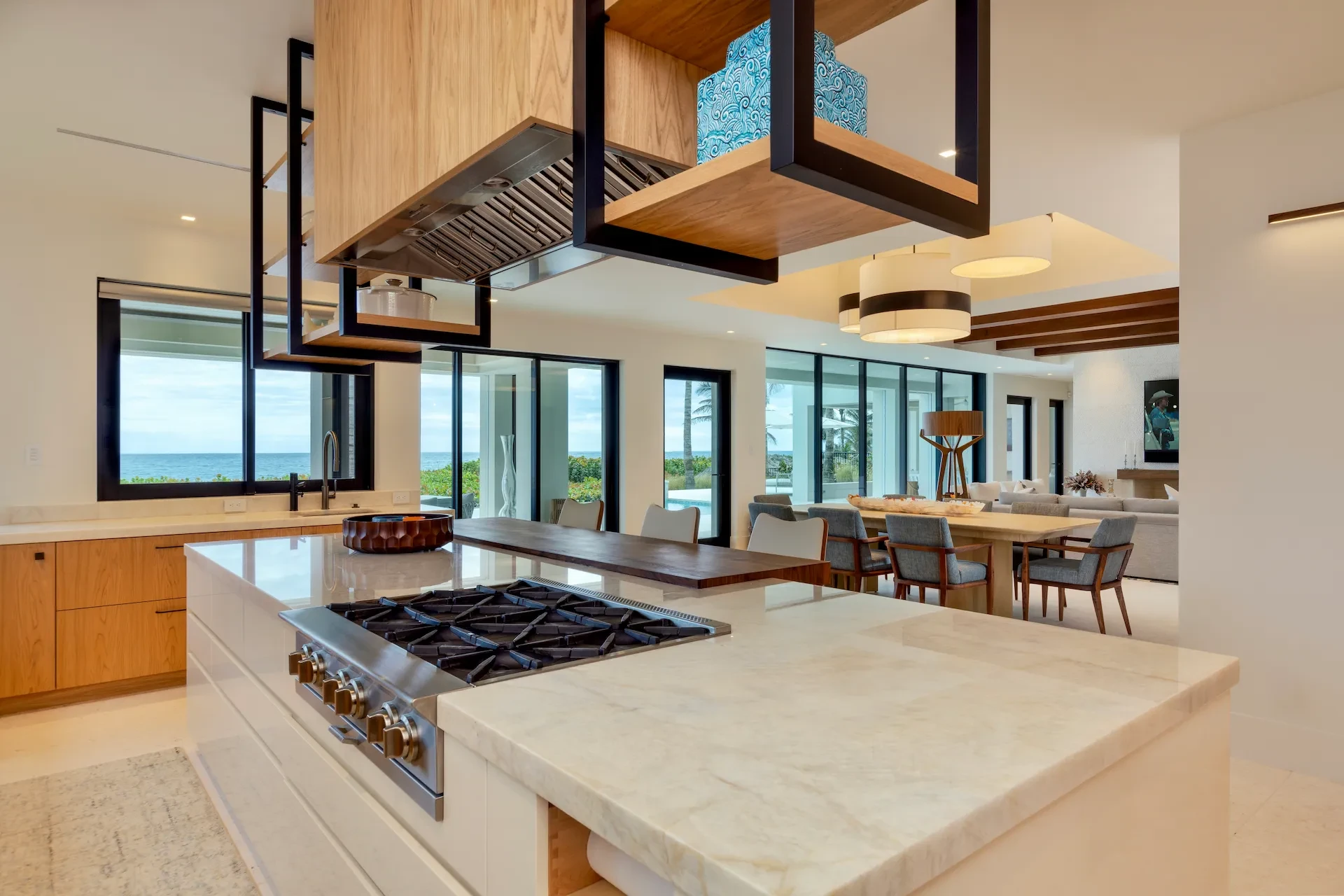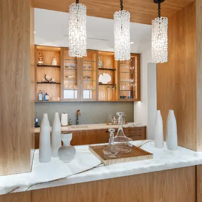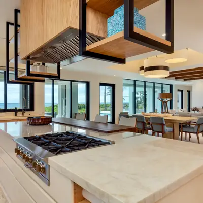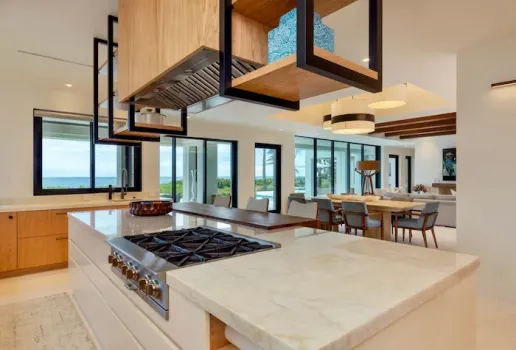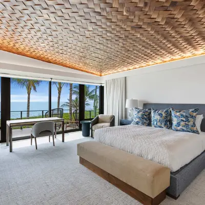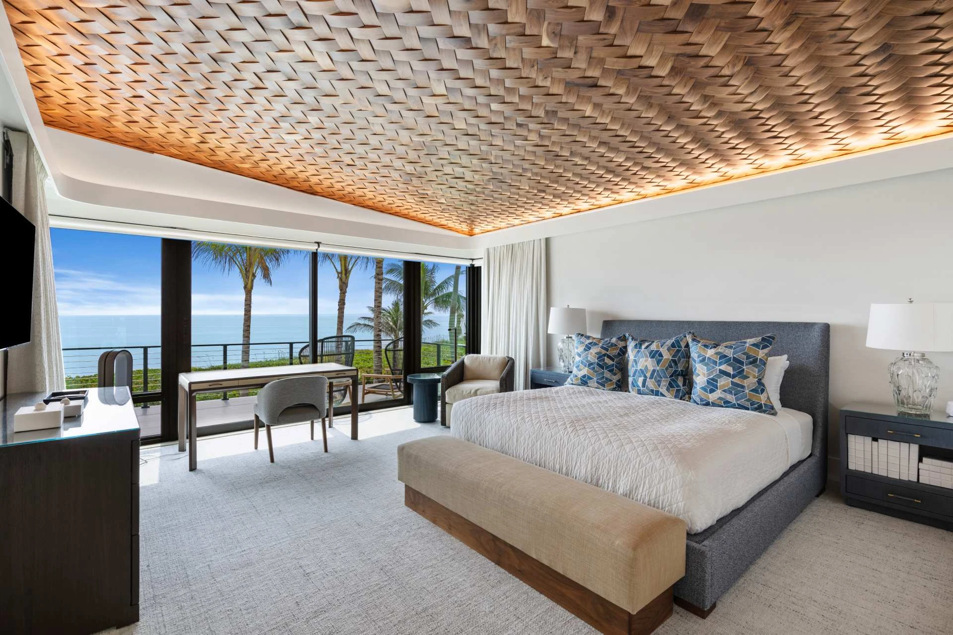Nestled along the Florida coast, this oceanfront home stands as a testament to the collaborative spirit of all who contributed to its creation, each bringing unique talents to weave together a tapestry of beauty and functionality. As the final touches were completed, the anticipation grew, with the owners' wedding just days away. The pressure mounted to ensure every detail was perfect, including carefully curated details, like the intricately woven walnut ceilings. The stakes were high, but the reward was immeasurable: a breathtaking setting for the beginning of our clients’ “happily ever after!”